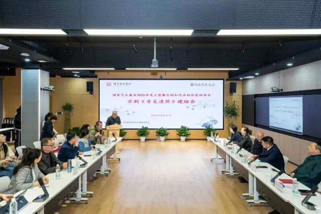 2026年4月12日,上海戏剧学院原创京剧《寻觅清照》举行建组会,创排工作正式启动。该剧不久前成功获得国家艺术基金2026 年度大型舞台剧和作品创作资助,前景令人期待。京剧《寻觅清照》的创排,精准契合《戏剧振兴三年行动计划(2026—2028年)》政策导向,亦是对上海戏剧学院戏曲学科建设与教学成果的充分肯定。据项目负责人、唱腔设计齐欢介绍,该项目由师生联合申报,是学校戏曲艺术创作与人才培养的重要突破。作品以“寻觅”为核心立意,深度传承李清照词韵风骨,积极探索京剧与古典文学、传统美学与当代审美融合的创新路径,始终坚守京剧本体艺术,立足史实与文学根基,塑造立体丰满的李清照艺术形象,打造思想精深、艺术精湛、制作精良的戏曲精品,并通过此剧的排演培育锻炼高层次戏曲专业人才,扩大中华优秀传统文化传播力,为学校后续艺术创作与基金项目申报积累经验。该剧导演郭宇作为主创代表发言。他介绍,《寻觅清照》由上戏专业博士魏睿编剧,整个创作团队也全部由上戏师生组成,充分体现了教学与实践的融合。针对李清照这一热门创作题材,团队坚持差异化、特色化创作,剧本历经十余轮打磨。此次创作坚守京剧本体,融合板腔体与昆曲曲牌体,