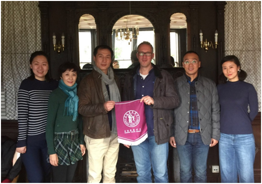 (图为何雁主任向罗斯布鲁弗学院赠送校旗)