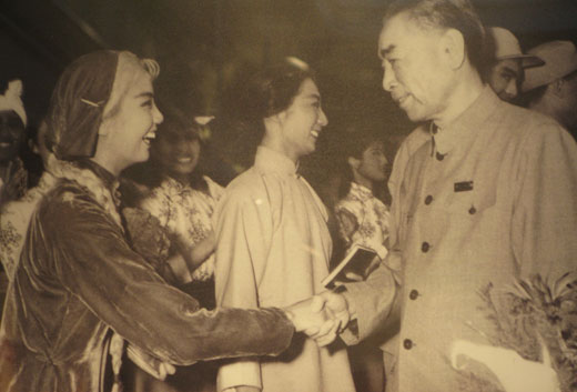 陈列馆中的老照片,图为周恩来总理与“白毛女”扮演者石钟琴亲自握手,周恩来曾十七次看《白毛女》。