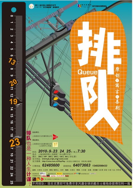 即将于9月23日上演于上戏剧院的原创寓言式喜剧《排队》的主创人员以上海戏剧学院05导演系的毕业生为主,作为上戏尖子生的他们专业素质过硬,自主创业打造了惜戏文化发展有限公司,曾先后接手过20多部话剧,多次在市政府各部门主办的晚会上担任执行导演、舞台监督、演员等职务,有丰富的舞台导、表演经验,自导自演的能力受到专家和观众们热烈的好评。为了体验“排队”的生活,演职人员们特地去世博会最热闹的场馆亲身经历目前最“时尚”的排队,而剧中的诸多笑点也是平时排练的灵感创作。