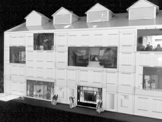 上戏率先创办的“创意学院”下辖3个专业,为艺术设计(含视觉传达、游戏动漫)、媒体创意和文化管理(创意与管理)。69名本科毕业生的数十件作品占据了上戏图书馆的三个楼面。其中,前两个专业的作品多为装置艺术。例如,围绕同一个卡通形象,从平面的T恤衫图案,到屏幕上的3D建模,再到玻璃钢雕塑。这类设计作品显示了“产业链”。以教学楼红楼为原型制作的“红楼梦”模型,选取了8个专业教室的场景,勾勒出活跃的学习氛围。在这个展览上,凡是屏幕都能被触摸、点击并生成全新的画面或视频。