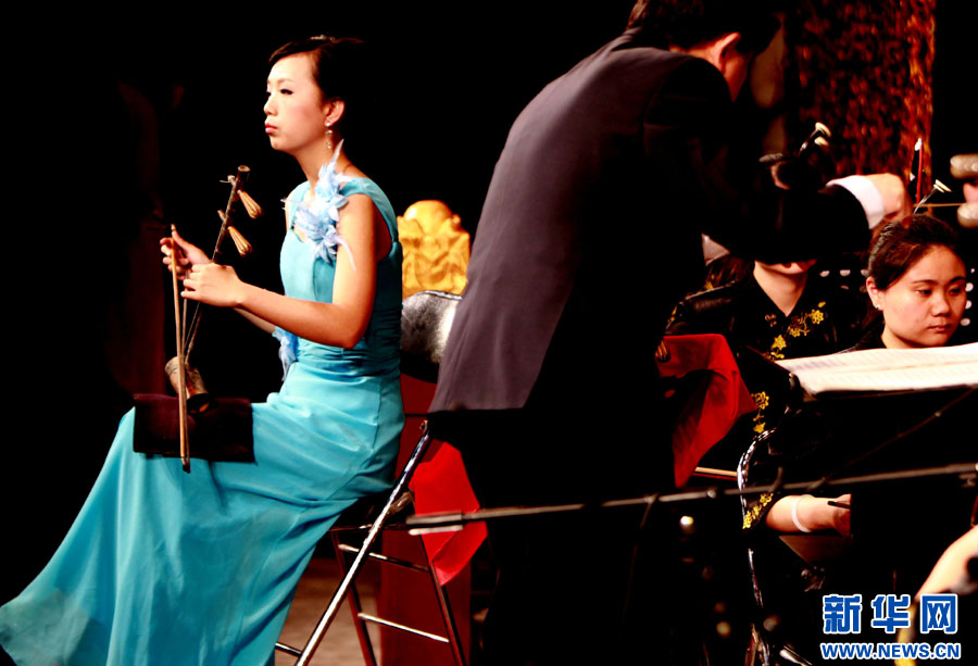 新华网上海5月10日电 5月9日,“杨梅‘剑出鞘’京胡音乐会”在上海天蟾逸夫舞台举行。杨梅是上海戏剧学院戏曲学院戏曲音乐专业四年级学生,自幼酷爱京剧艺术,十岁拜师学习京胡,至今已参加《鸿门宴》、《红灯记》等30多出剧目的演出。2009年曾赴英国、奥地利参加与欧洲戏剧艺术的交流活动。