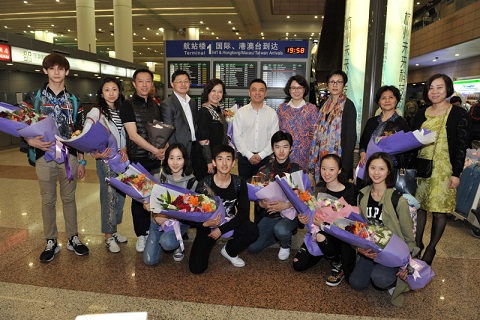 上海戏剧学院副院长张伟令(中)等领导在机场迎接载誉归来的舞校师生 上海舞校供图