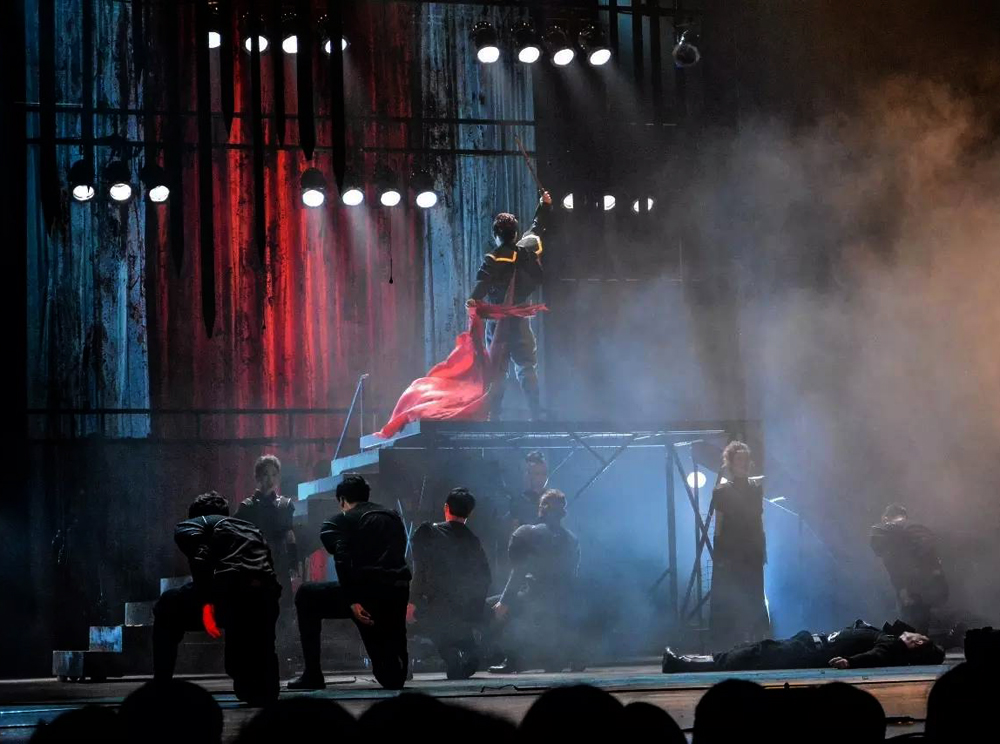 《麦克白斯》舞台融合了黑与红的元素,将残酷与破损化的环境氛围发挥到了极致,萦绕着舞台的是主人公严肃与冷峻的气场。看似不见底的舞台纵深感让故事的情节更绵延不绝,无论是英雄的诞生和毁灭,还是恶魔的出世和封印,都是麦克白斯的属性。破损化的楼梯构造的城楼无时无刻不在诉说着戏剧的语言,推动了整个故事的发展。冷色调的灯光把人物的内心暗示表达得更加直接与深刻,多角度的投影将视觉呈现得更加有冲击力,剧中人物的塑造显得更加立体与饱满。令人震撼而激动的音乐加深了观众对剧情的疑问与好奇,引发观众对“预言还是欲望“的思考。