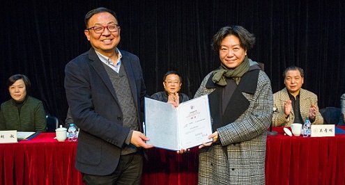 上戏党委书记楼巍为上戏青年剧团艺术总监田沁鑫颁发聘书 刘佳奇 摄