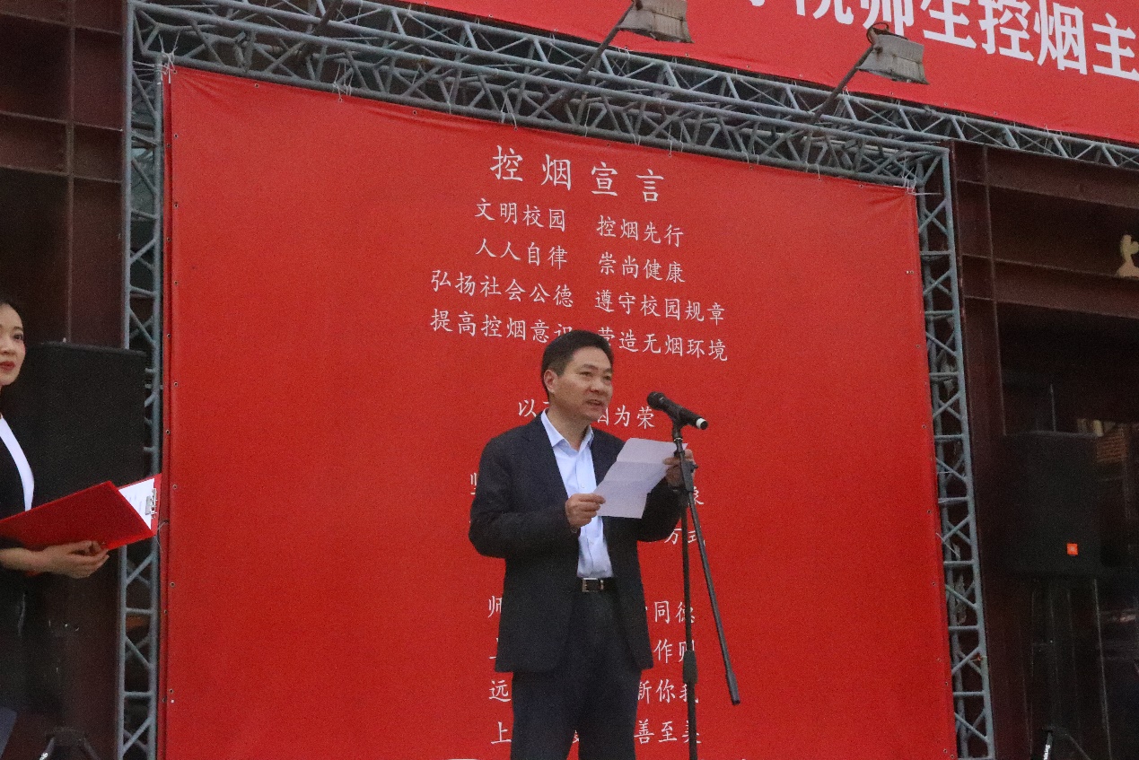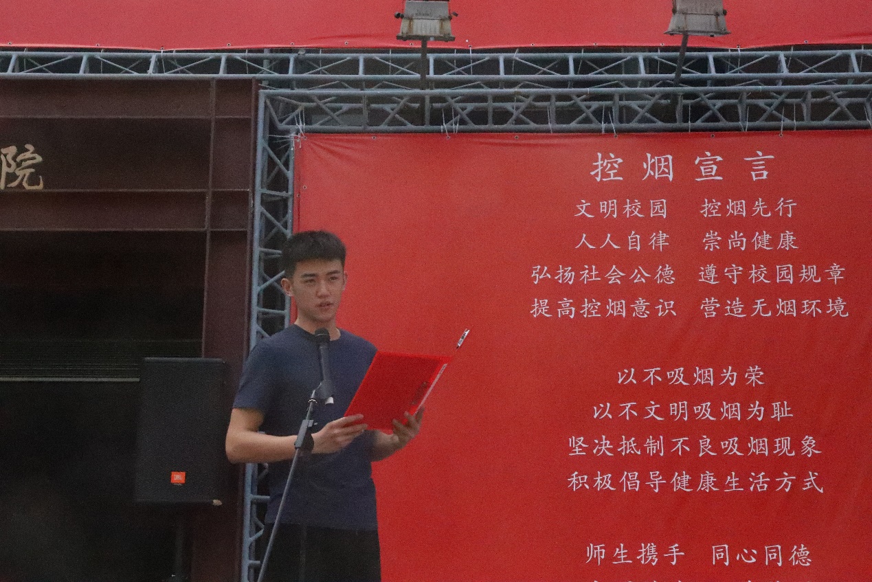 活动现场,全体师生学跳第九套广播体操。学校副院长唐立兔宣读校园控烟宣传员名单,党委副书记胡敏颁发校园控烟宣传员聘书,宣布三个校区吸烟点区域。教师代表、学生代表发言表示:要倡导健康的生活方式,共创无烟文明校园。