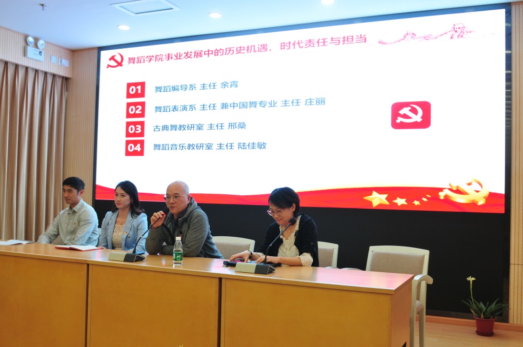 第四板块,舞蹈编导系主任余霄、舞蹈表演系主任兼中国舞专业方向主任庄丽、古典舞教研室主任邢桑、舞蹈音乐教研室主任陆佳敏分别结合上海教育大会精神,结合实际工作,围绕舞蹈学院事业发展中的历史机遇、时代责任与担当展开讨论并做了工作表态。