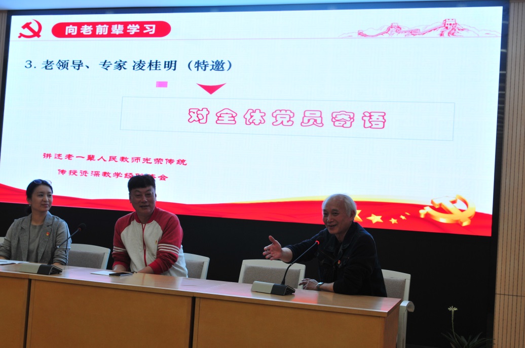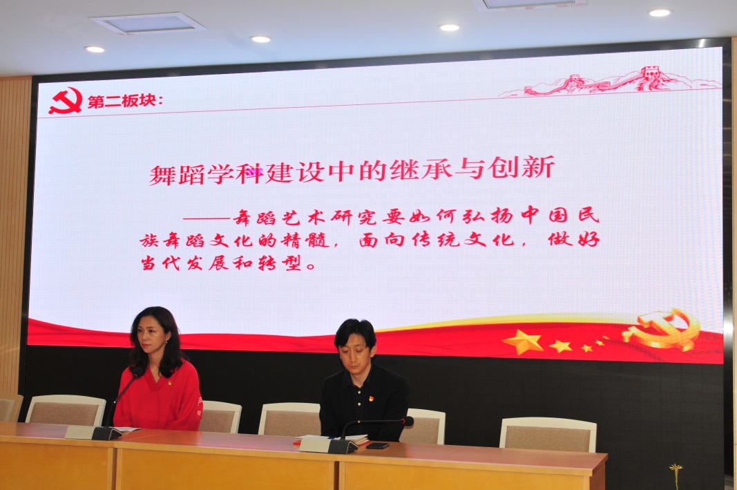 第三板块,组织委员马人聪老师结合自己40年的从教经验,畅谈“立德树人”;宣传委员赵慧萌介绍“为人、为师、为学”先进典型事迹,激发教师向典型学习,潜心从教、立德树人;舞蹈学院前院长、退休党员凌桂明对全体党员发出了谆谆教诲,让各位党员要热爱党,热爱党的舞蹈教育事业。