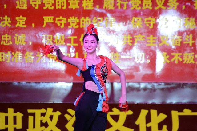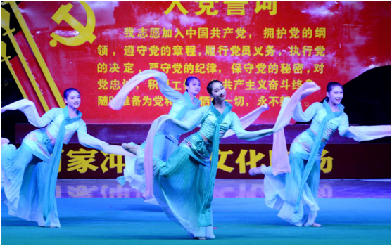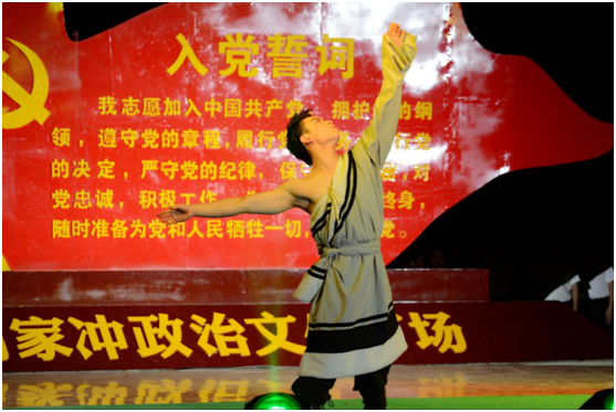 专场文艺晚会上,来自于上海戏剧学院暑期社会实践团的师生和信阳市文化旅游系统的文艺工作者们合作为革命老区何家冲的乡亲父老们带去了一场内容丰富,形式多元,精彩纷呈的综合性文艺演出。现场的节目从舞蹈到歌曲再到传统戏曲,每一个作品都倾注了创作者与表演者的热情与专注,台上演的精彩,台下掌声欢呼声此起彼伏,高潮迭起。实践团中来自于舞蹈学院中国舞专业的8位同学为本次文艺晚会带来了精心排演的女子四人舞《吉祥》、男子独舞《渡生》、女子群舞《采薇》、男子四人舞《英魂》和女子独舞《红蜻蜓》,精湛的舞技,优美的舞姿、用心的演艺,赢得了当地老百姓真挚地欢呼;来自继续教育学院音乐表演专业的5位学生与专业教师石灵带来了3首由该专业负责人张重远老师领衔师生新编经典歌曲:男女对唱《红旗飘飘》、吉他弹唱《渔光曲》、合唱《同一首歌》,优美而现代的旋律打破了传统经典歌曲的固有节奏,让人耳目一新,学生们独特的嗓音与生动的演唱,老师用心的演奏与纯熟的技巧,获得了大家的肯定与掌声。