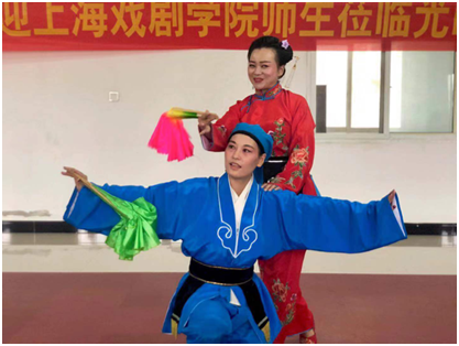 下午,师生们一行来到了光山县花鼓戏传承中心,进行艺术观摩与交流。光山县花鼓戏艺术家们为我们表演了传统经典花鼓戏片段《夫妻观灯》和《顶椅》。作品传承着中华传统文化的不朽魅力,同时也讴歌新风新貌、新变化,凸显了信阳本土文化的地域特色。在了解了光山花鼓戏传承中心对花鼓戏的传承与研究所做出的努力和取得的成就,让在场的师生由衷地感受到了对稀有剧种的活态传承的重要性,同时也感受到了稀有剧种的独特魅力,积极推动稀有剧种健康发展的迫切性,希望通过更多的人来留住民族文化的根脉。看完精彩的演出后,上戏实践团的同学们也交流了自己的专业,展现了独特的舞姿,也交流了自己的直观感受与体会。