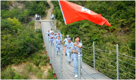 2019年上海戏剧学院“小我融入大我,青春献给祖国”暑期社会实践团来到革命老区信阳,就是怀揣着坚定的理想信念,为了追寻初心坚守信仰,为了熏陶革命精神,接受红色教育,更为了增强党性锤炼心志牢记使命。在红色军旗迎风飘扬中,穿着统一整齐红军服的上戏人,在院长黄昌勇老师的亲自带领下,显然成了“长征起点”何家冲红军小道上一道亮丽的风景线,雄赳赳,气昂昂,跨过铁索桥,奋勇拼搏,以青春的名义,以新青年的风采,逐梦中国特色社会主义新时代新征程!
