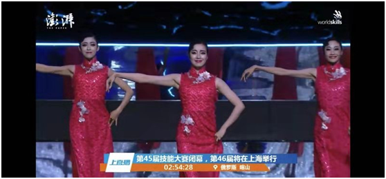 8月27日晚,第45届世界技能大赛闭幕式上,俄罗斯联邦总统普京、世界技能组织主席西蒙·巴特利分别致辞。在会旗交接仪式上,世界技能组织会旗依次交接给汪永清、张纪南和应勇。文艺表演环节,上海将一场主题为“魅力中国、活力上海”的十分钟表演奉献给全世界观众。一个海纳百川的现代化国际大都市展现在全场观众面前,以充满活力的姿态向世界宣告:2021,上海准备好了!