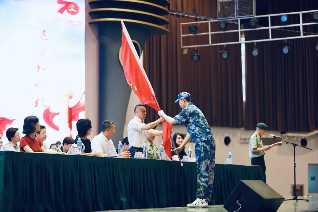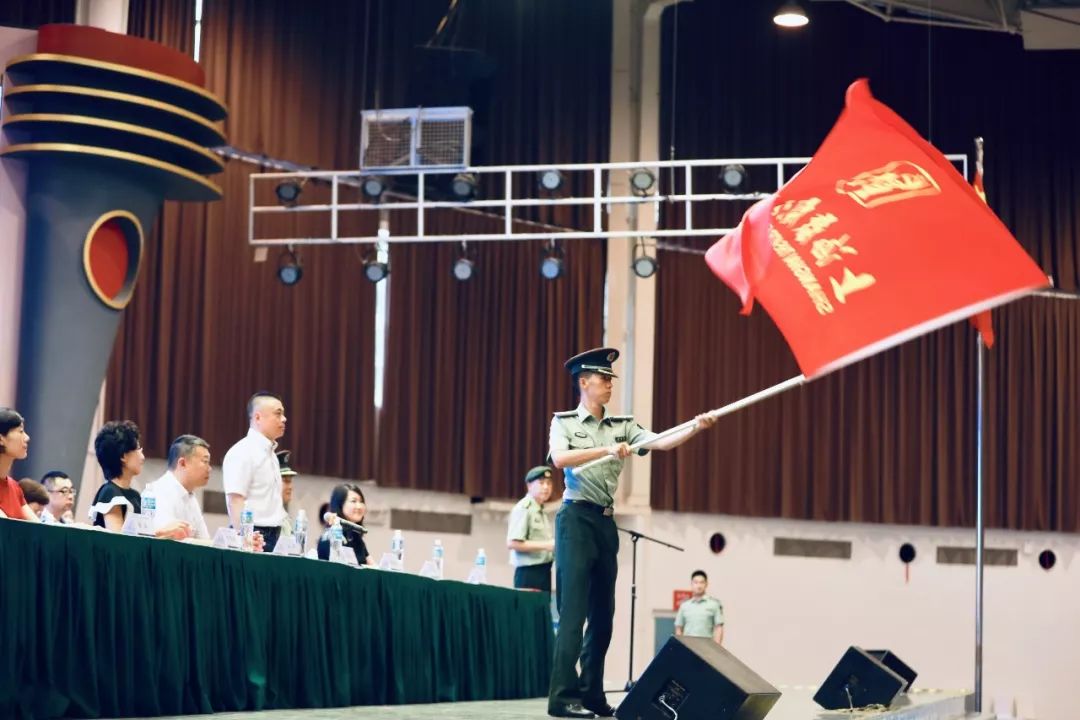 党委副书记、副院长张伟令向军训总教官授旗,接下来的8天时间里,新生们将在军训基地完成新生开学的第一课。