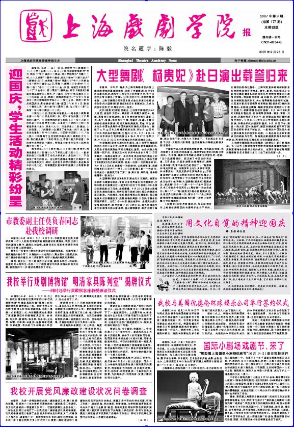 《上海戏剧学院报》2007年第9期(总177期)已出版,电子版现已上传。本期重点内容有:《迎国庆,学生活动精彩纷呈》、《大型舞剧《杨贵妃》赴日演出载誉归来》、《市教委副主任莫负春同志赴我校调研》、《“我校举行戏剧博物馆“明清家具陈列室”揭牌仪式》、《我校开展党风廉政建设状况问卷调查》、《用文化自觉的精神迎国庆》、《我校与美国倪德伦环球娱乐公司举行签约仪式》等。
