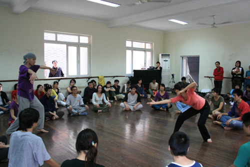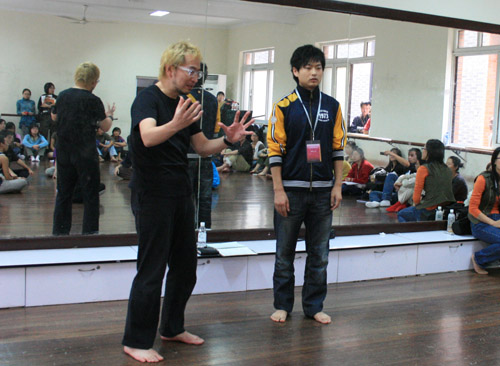 该日的工作坊上,《狂人教育》的导演长野和文先生介绍了一系列对池之下团员的训练方法,包括基础的演员释放天性的练习、传统的日本舞蹈练习、以及在《狂人教育》中演员们人偶演出的训练方法,并在演员们一一演示过后,带领着到场的老师同学一起进行了练习,赢得了在场人员的热烈响应。最后的答疑时间上,长野先生一一听取了老师同学们提出的问题,并认真耐心的予以了答复。工作坊在欢乐氛围中,圆满结束。