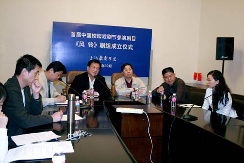 建组仪式上,各位领导表达了对这部戏的支持,也传达了市教委对我们这部戏的期望,同时也为我们下达了重要的任务――排除万难,顺利圆满地完成《风铃》排练演出任务,为明年三月的首届校园话剧节作准备。大四学生王文娜代表剧组演员向学校表态:我们一定会不负众望,拿出我们最好的水平代表学校乃至上海市向话剧节的金奖冲刺。最后由王学明老师和陈莹老师向各小组分配了具体的任务和排练的日程安排。