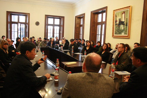 会面后,双方在我院佛西楼会议室举行座谈会,我院部分师生参加了座谈。会上葛朗老师详细介绍了我院的综合校情,并热情回答了代表团成员的提问。