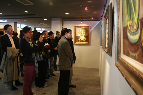 图为来宾兴致勃勃地参观画展
