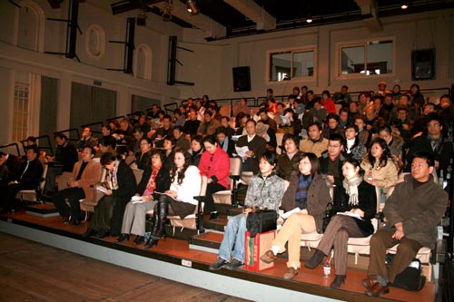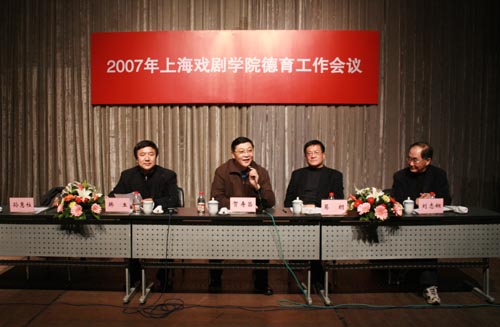 在学习贯彻十七大精神的活动中,经过党委各职能部门和有关院系党组织的精心准备,2007年上海戏剧学院德育工作会议于今日下午在新空间剧场举行。出席会议的学校党政领导有:贺寿昌、葛朗、韩生、刘志钢、孙惠柱以及全体中层干部和班主任、辅导员共计150人左右。韩生同志主持会议。葛朗同志代表党委作工作报告,对明年工作、特别是德育工作的出发点、着力点进行动员。贺寿昌同志发表讲话,希望全体上戏人以更加饱满的精神状态学习、贯彻好十七大精神,为每年德育工作和学校全面工作的更上一层楼努力。