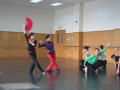 图为:04级民间舞专业班主任周蓓老师在给学生做示范