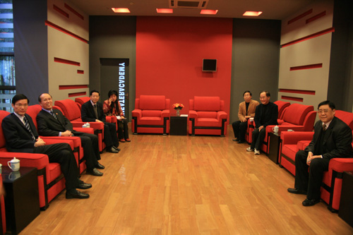市人大常委会副主任周禹鹏(左二)、团市委书记马春雷(左一)等与我校领导刘志钢以及宣传部部长张生泉亲切座谈