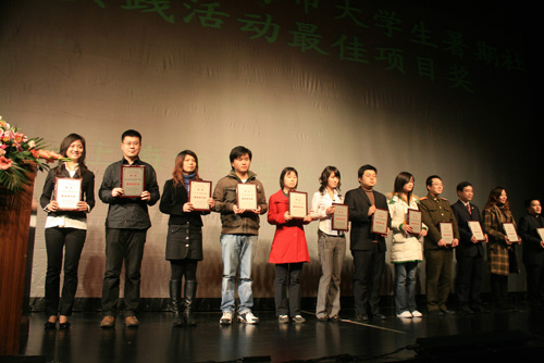 表彰大会上总结了2007年上海市大学生社会实践活动情况,宣读了2007年上海市大学生暑期社会实践活动表彰的决定,宣读了第二批上海大学生社会实践基地命名的决定,向2007年上海市大学生暑期社会实践活动优秀组织奖获奖单位和最佳项目奖获奖团队颁奖,向第二批上海大学生社会实践基地授牌,我校“玩偶之家”暑期社会实践团队荣获“上海市大学生暑期社会实践活动最佳项目奖”。