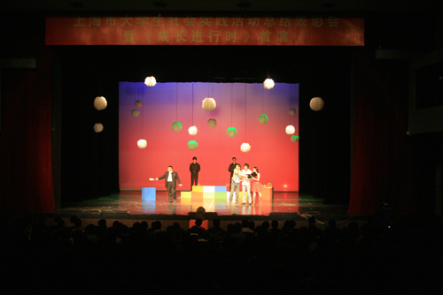 今日下午2点半,2007年上海市大学生社会实践活动总结表彰大会暨《成长进行时》首演仪式在实验剧院隆重举行。市人大常委会副主任周禹鹏、团市委书记马春雷、市文明办副主任晁玉奎、市教委党组成员、纪检组长阮显忠、团市委副书记徐枫、团市委学校部部长金梅等领导,以及市学联主席浦栋麟,在我校领导刘志钢,有关负责人黄桂英、张生泉、邱中岳、陆军、徐咏、陈云的陪同下出席并观看了演出。来自上海市各高校的有关负责人和学生约800余人参加了会议。