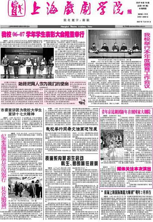 《上海戏剧学院报》2007年第13期(总181期)已出版。本期重点内容有:《我校06-07学年学生表彰大会隆重举行》、《我校举行本年度德育工作会议》、《市委宣讲团为我校大学生宣讲十七大精神》、《纪念朱端钧诞辰百年活动举行 社会反响强烈》、《表演系内蒙招生启动 韩生、葛朗前往视察》、《我校举行闵希文油画近作展》等,敬请关注。
