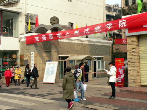 我校08年招生考试成都考点的报名工作,今天起开始。2月的川蜀大地,虽然阳光明媚,但是气候温度还是在0度到5度之间。上午8:30刚到,考生们已经冒着寒冷的北风赶到现场陆续报名。根据有关规定,我校将在这里设置表演、导演、戏文、剧场技术管理等系和专业的考试。在四川艺术学校有关同志的积极配合下,考点的后勤保障工作做得不错。报名处,有暖气;考生口渴了,有热水和一次性杯子;对考生的疑难问题,我校有专门同志做耐心和周到的解释。特别是现在一些考生,向往戏剧艺术,特别是向往上海戏剧学院,但对于自己合适考什么,还一时拿不定主意,工作人员就在现场认真做了咨询,直到考生和家长满意为止。截止记者发稿时,成都考点的考生还在不断涌来,预计报考人数将大大超过去年。(图、文:白水;编辑:雨田)