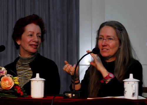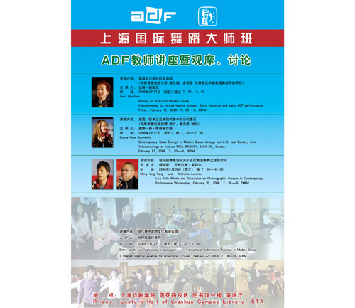 按照国际舞蹈大师教学计划,在大师授课期间,将安排四次专题讲座和若干次作品欣赏课。2月15日晚7:30分,经过了一天的辛勤授课,大师班的五位专家全部来到莲花路校区图书馆报告厅参加讲座。第一讲由美国舞蹈节资深教师洁瑞・胡勒汉主讲,她凭借着对美国现代舞历史研究造诣,与自身丰富的实践相结合,以题为《美国现代舞的历史回顾(马莎・格兰姆、多丽思・汉弗莱及早期舞蹈节)》,拉开专题讲座的序幕。