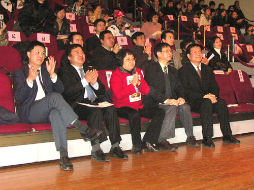 图为陈东副部长(右三)和王奇副主任(右二)在我校领导韩生(左二)葛朗(右一)孙惠柱(左一)陪同下观看大师班汇报演出