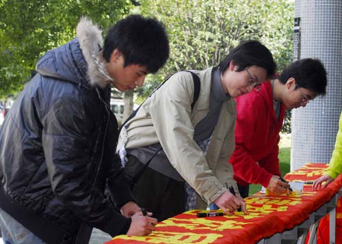 此外,还有部分热心同学表示:希望类似活动,其形式能更加丰富多彩,例如:播放有关的影像资料等等。据悉,满载学生热情与心意的签名横幅将悬挂于校内主干道上,成为校园内一道美丽的风景。