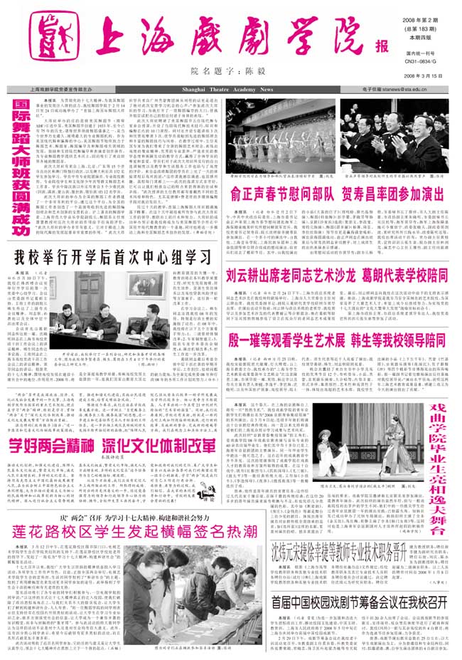 《上海戏剧学院报》2008年第2期已出版(总183期)已出版。本期重点内容有:《国际舞蹈大师班获圆满成功》、《俞正声春节慰问部队 贺寿昌率团参加演出》、《刘云耕出席老同志艺术沙龙 葛朗代表学校陪同》、《殷一璀等观看学生艺术展 韩生等我校领导陪同》、《我校举行开学后首次中心组学习》、《戏曲学院毕业生亮相逸夫舞台》等,敬请关注。