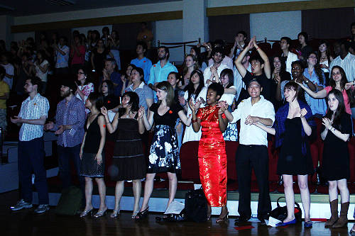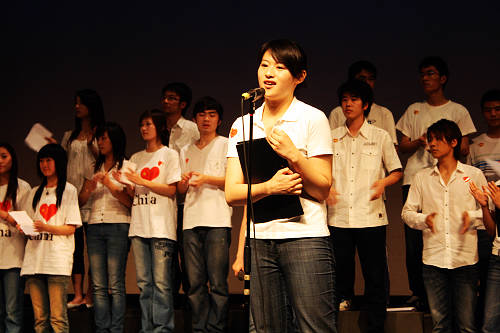 同学们轮番上场,各自以第一人称为我们讲述了在地震中震撼人心的一个个故事,真实的故事,他们将永远不会被我们忘记。那为了保护学生而失去生命的一位位老师,那个一天连续母乳哺乳了8个婴儿的年轻女警,那个一直忍着剧痛坚强活着,直到让女友获救的年轻男孩,那个在余震来临之时,为保卫战士们的生命而来不及救出埋在眼前的老父亲的排长……这一幕幕感人画面的再现,使很多观众们都留下了热泪。晚会其间还连线了我校04级主持专业奋战在四川的志愿者,了解灾区的情况,并将大家的祝福带给了他们。舞蹈和歌曲穿插在节目当中,让观众从听觉和视觉上都强烈的感受到了汶川地震灾害所带来的损失。连不很懂中文的留学生在观看后都禁不住对我说,从音乐、表情和声音的变化上都能感受到那种人性的美好。在演出结束前,05主持的藏雅菲同学还宣读了一份倡议书,倡议大家要认真学好自己的专业知识,用自己的真才实学为灾区、为祖国奉献自己的一份力量。最后的诗朗诵和合唱更是将整个晚会推向了高潮,演员们跳下舞台,站到观众之间,所有的人一起随着音乐的旋律唱出我们对祖国爱和灾区人民的关怀。此时,所有的人都只有一个信念,就是,我们要好好的活着,要坚强!随着台上的呼喊,全场一起高喊着:“中国加油!中国加油!”一遍一遍的呼声,萦绕在我们的耳畔和心间,给予了我们莫大的勇气,和奋斗的力量。