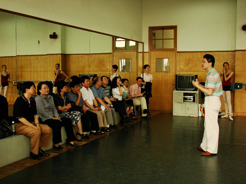 图为翁铁慧等领导在听取舞蹈学院院长陈家年汇报排练情况