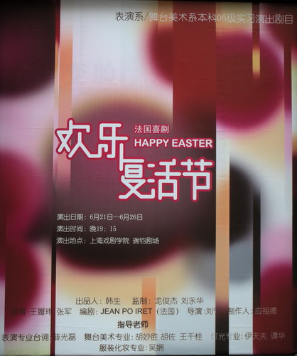 6月21日―6月25日晚19:15,表05(1)班实习大戏《天慈与子翰》将于黑匣子剧场上演。 6月21日―6月26日晚19:15,表05(2)班实习大戏《欢乐复活节》将于端钧剧场上演。欢迎全校师生观看。