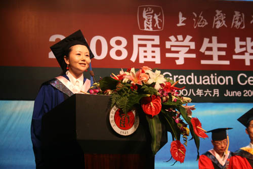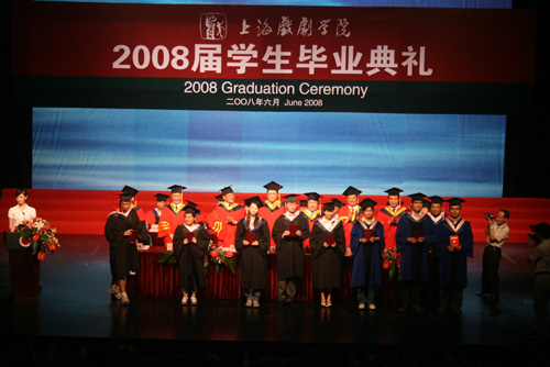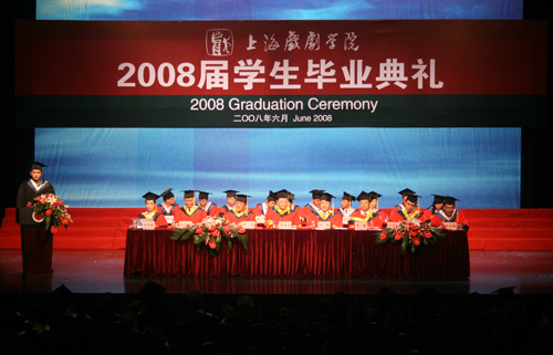 6月26日下午,2008届学生毕业典礼在上戏剧院隆重举行,校领导贺寿昌、韩生、葛朗、楼巍、刘志钢、孙惠柱、徐幸捷,学术委员会主任叶长海,各院系领导龙俊杰、刘永华、陆军、卢昂、赵韫颖、陈家年、孙福良,教务处长陈其毅、研究生部主任宫宝荣、公教部副主任陈敏等在主席台就座。各(院)系和有关部门领导、研究生导师、毕业班班主任辅导员和全体应届毕业生一起出席了毕业典礼。毕业典礼由孙惠柱副院长主持。