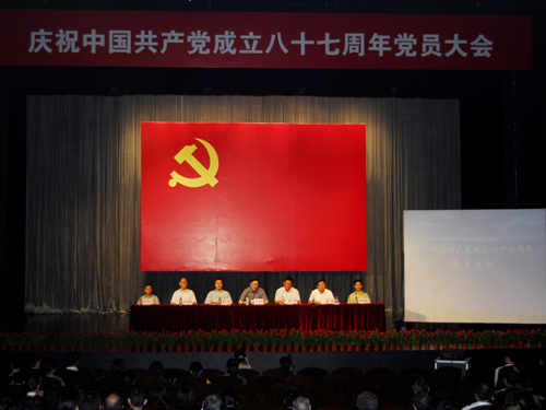 今天是伟大的中国共产党成立87周年的纪念日。我校全体共产党员今天下午在上戏剧院隆重集会,热烈庆祝党的生日。党委书记贺寿昌、主持工作的副院长韩生、党委副书记葛朗、党委副书记楼巍、副院长刘志钢、院长助理徐幸捷、党委委员沈炜元等领导在主席台就座。