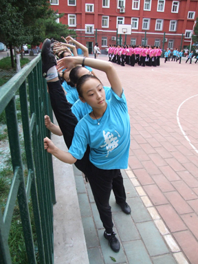 7月30日早上6:00,全体演员在总政招待所旁边的篮球场上进行了进京后的第一次排练。当时针指向7点多时,由于准备工作没有很到位,不少同学都有些轻微的乏力和眩晕现象,但也都咬着牙坚持着……