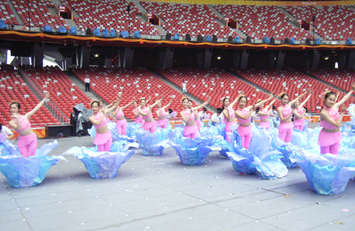 当时针指向凌晨3点多时,经过层层安检、又根据训练安排而等候已久的代表团一行,坐在了鸟巢的看台上。国家体育场的宏伟震撼着代表团每一位成员的心弦,想到能在这样的场地出现自己曼妙的舞姿,同学们的心激动着……冷了,互相抱着用身体取暖;饿了,一块巧克力几个人分享;困了,靠在椅背上打个盹。凌晨5点时,随着各演出团队的陆续抵达,终于响起了导演“开始走场合练”的声音,当第二遍正式带音乐彩排结束后,空旷的体育场响起了许多热情的掌声,人们为“上海紫竹调―海派秧歌”的清新和优雅而鼓掌。回到招待所时,已是上午8点50分了。为精益求精,节目编导又下达了下午5点30分排练的通知,同学们累――并快乐着……