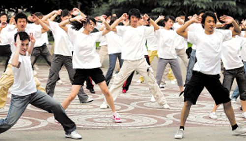 昨天,上海演出团的演员们顶着烈日进行了出征前最后的排演。 李君娜 摄(原载《解放日报》2008-08-14 03版)