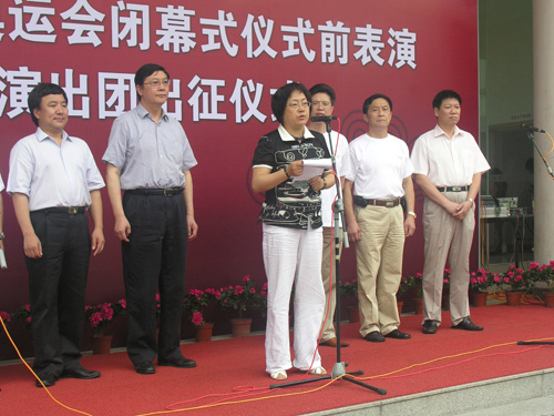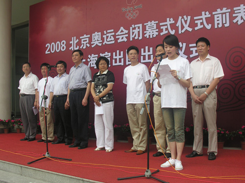 出征仪式由上海市文广局副局长刘文国主持。市委宣传部陈东副部长讲话并宣布上海演出团班子:团长刘文国(上海市文广局副局长),副团长韩生(上海戏剧学院主持工作副院长)、顾成明(上海戏剧学院舞蹈学院党支部书记)、蒋正平(上海杂技团团长),总协调李晓燕(上海市文广局重大文化活动办公室副主任)。陈东副部长在讲话中殷切期望上海演出团全体同志,要以高度的政治责任感,良好的精神面貌,全力以赴,不辱使命,努力完成任务,把中国青年的风采、上海大学生的风貌,展现在全球40亿观众面前。为奥运作贡献,为国家争荣誉,为上海添光彩!在上海戏剧学院党委书记贺寿昌的领誓下,演出团的全体演职员进行了庄严的出征宣誓。同时,演出团副团长、上海戏剧学院主持工作副院长韩生庄严地从陈东副部长手中接过了“2008北京奥运会闭幕式仪式前表演上海演出团团旗”。 上海戏剧学院青年舞蹈团青年演员茅晓芳代表全体演员发言。在领导的“出发”号令下,全体演职员精神抖擞地登上了等候已久的客车去上海火车站,踏上去北京的征程。