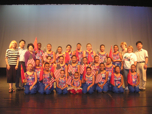 在访问中,美国客人先到舞蹈学院的芭蕾舞和民族舞两个专业的教室进行参观。整洁宽敞的教室、严谨认真的教风和激情四射的学风,都给客人们留下了深刻的印象。在离开教室时,他们情不自禁地提出要与师生们合影留念。在接下来的双方交流演出中,舞蹈学院为客人们准备了芭蕾的教学片段集锦展示、民族舞《花儿为什么这样红》等节目。客人们在我们每个节目结束时都全体起立给予鼓掌致谢,他们说:“你们的民族舞太好了!芭蕾舞也好。我们到过一些芭蕾舞发源地国家参观过,你们的水平是一流的!”客人们为我们表演了具有浓郁美国风格的舞蹈,这些节目在13日晚上的旅游节开幕式上也大多要演出的。当他们最后手持中美两国国旗跳起《和平颂》时,全场观众再次鼓掌,气氛达到高潮。