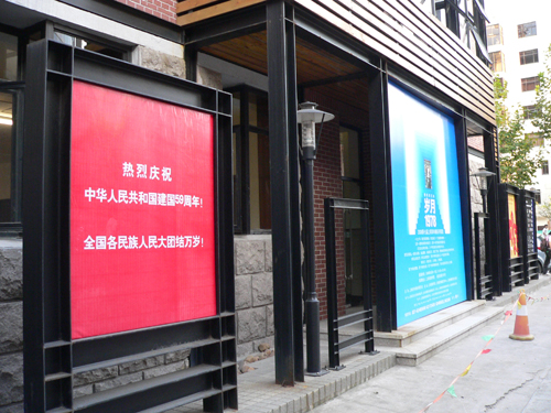 庆祝国庆的标语和巨幅广告牌把华山路校区的红楼装饰得更美丽