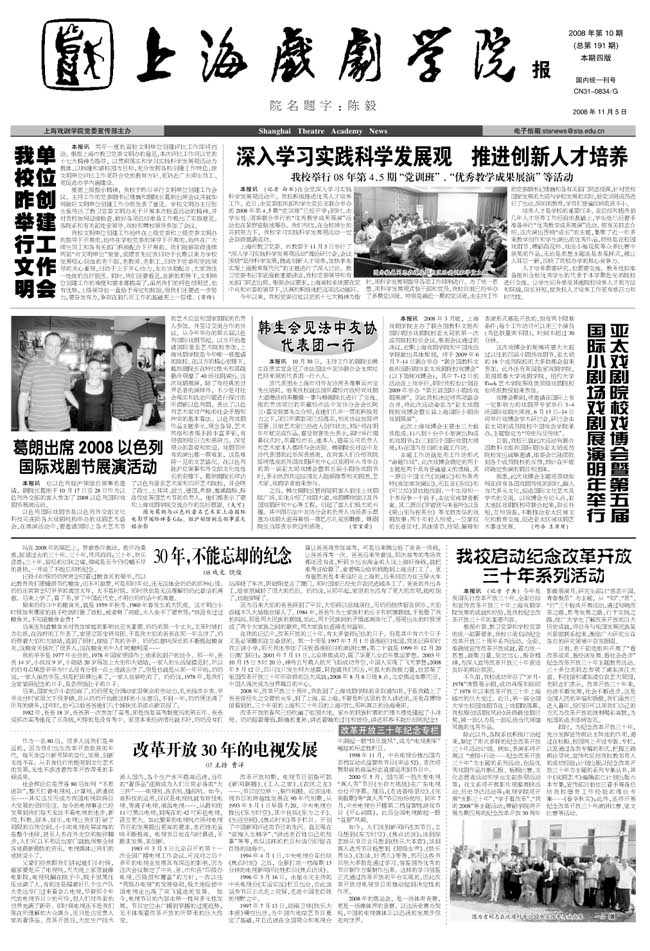 《上海戏剧学院报》2008年第10期已出版(总191期)已于11月5日出版。本期重点内容有:《我校昨举行文明单位创建工作会》、《深入学习实践科学发展观 推进创新人才培养》、《葛朗出席2008以色列国际戏剧节展演活动》、《韩生会见法中友协代表团一行》、《亚太戏剧院校戏博会暨第五届国际小剧场戏剧展演明年举行》、《我校启动纪念改革开放三十年系列活动》等,敬请关注。