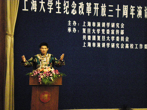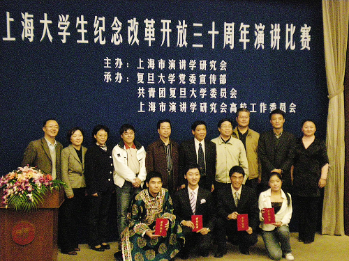 上海大学生纪念改革开放30周年演讲比赛昨天(11月18日)下午在复旦大学逸夫楼报告厅举行。复旦大学校长助理桑玉成代表承办单位向来自上海27所高校的选手表示欢迎。经过激烈角逐,我校内蒙表演班选手尔奇斯与华东师范大学赵梦然、同济大学苏龙霞、上海中医药大学陈醇一起荣获一等奖。上海市演讲学研究会会长刘德强、上海市教卫党委宣传处副处长劳晓芸、上海市教委德育中心主任王垒、上海教育电视台副台长张伯安、上海市演讲学研究会秘书长姚俊吾等领导担纲评委并向获奖者颁发证书。