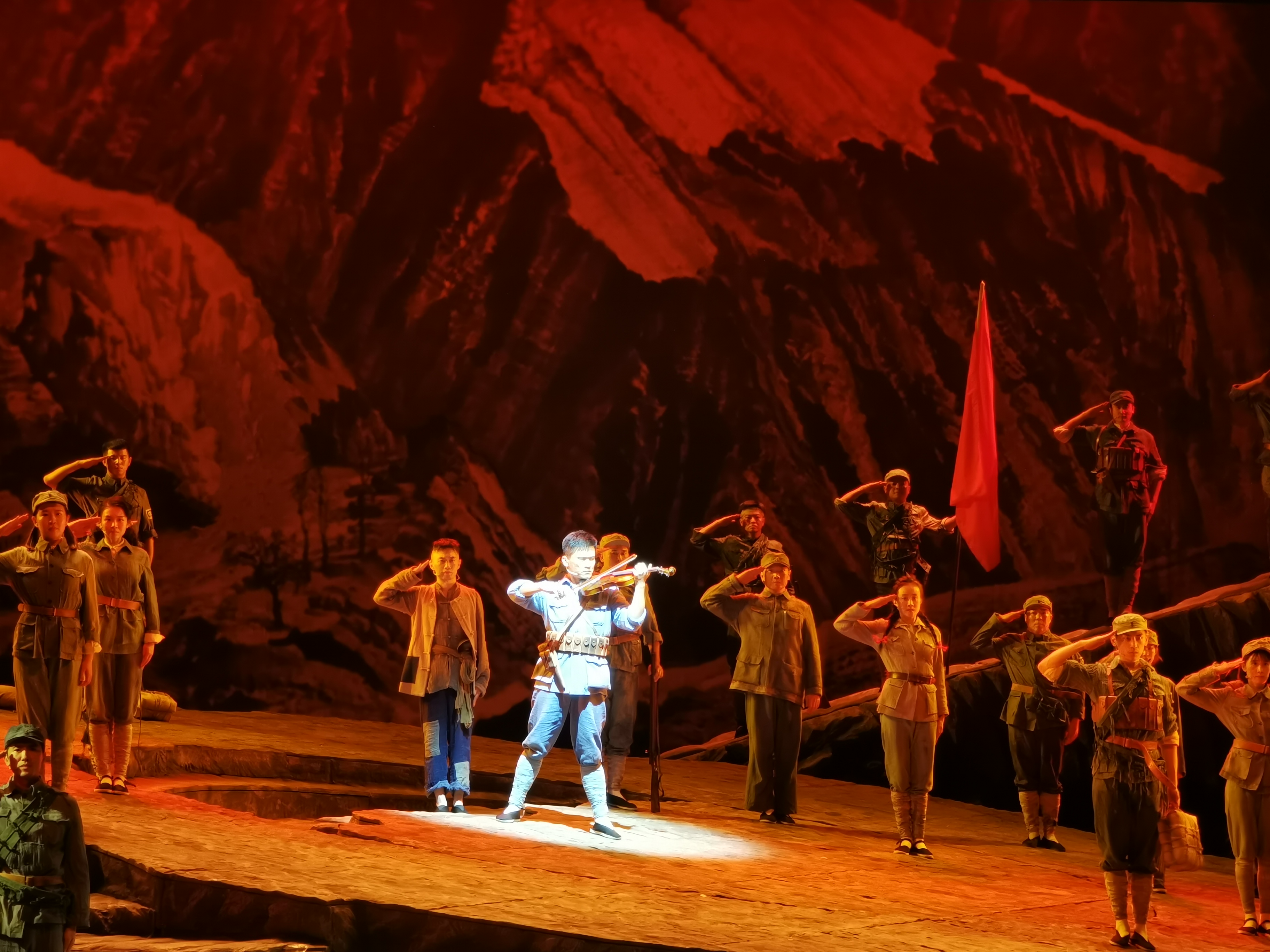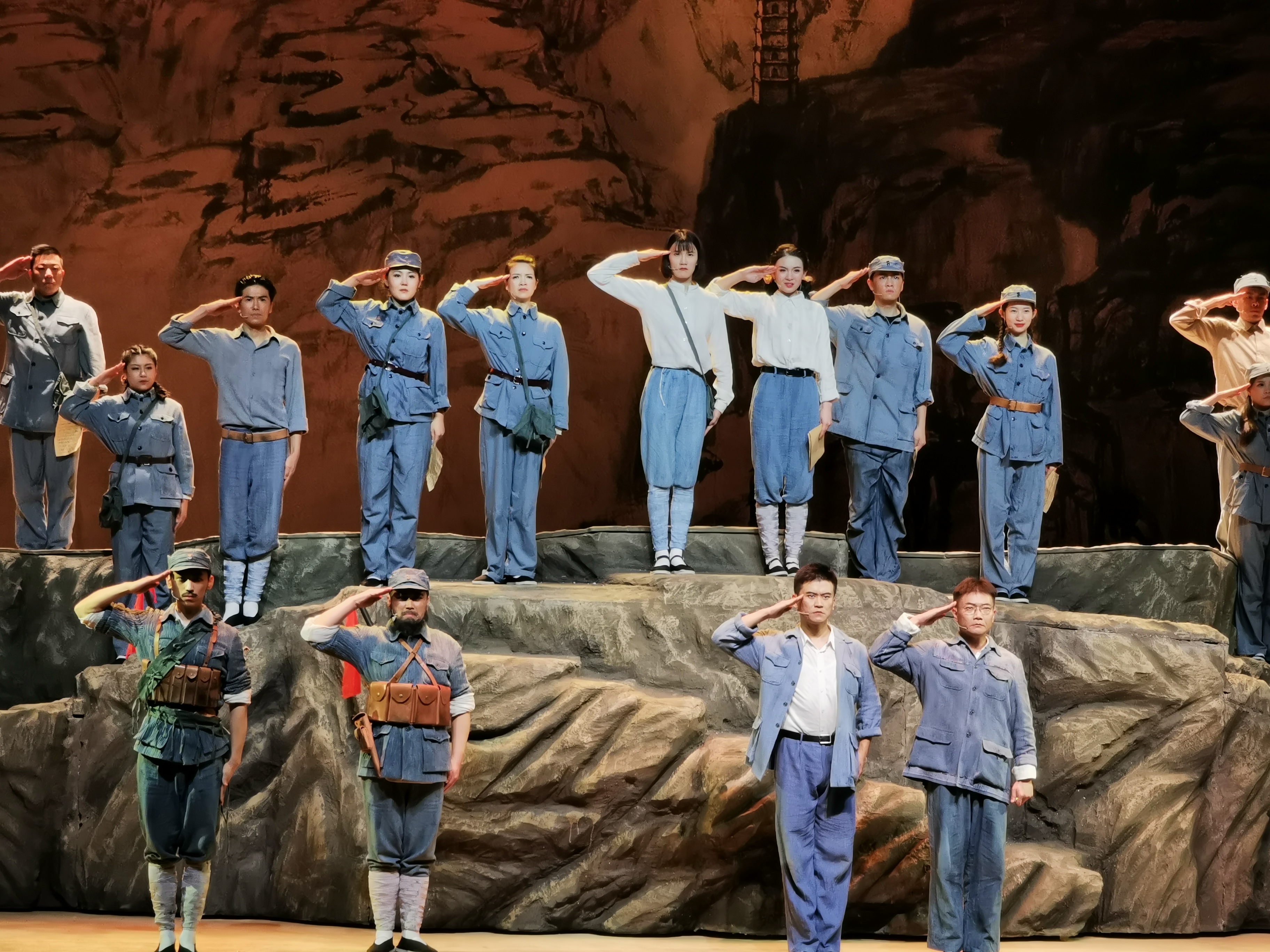 全剧尾声处,多媒体出现英勇的八路军战士迈着整齐、坚毅的步伐从抗日战争走过解放战争,从全国解放走向二十一世界中国人民解放军现代化的大阅兵英武画面……渲染出中国人民解放军百年浴血奋战、勇往直前的浩荡军威!中华民族正是高唱着这首气势如鸿的辉煌乐曲,一往无前,不可阻挡,昂首阔步走在中华民族伟大复兴的征程上。