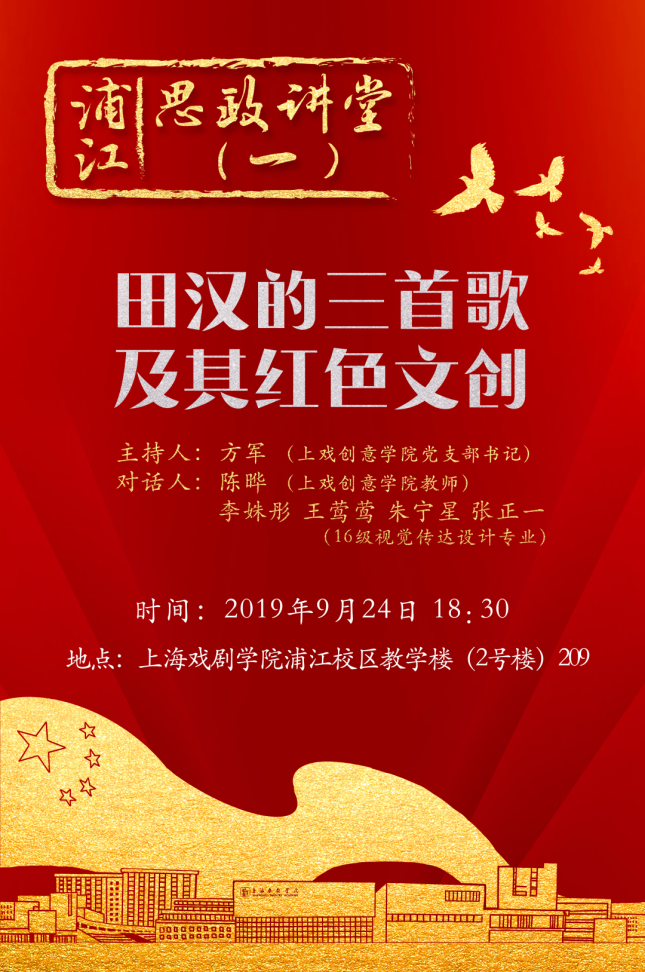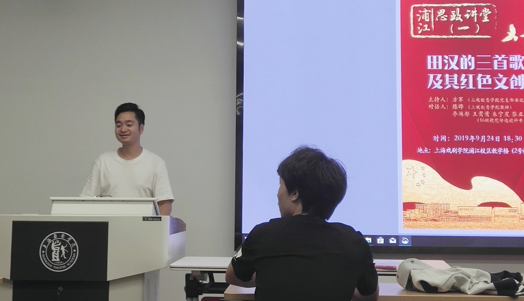 9月24日晚,创意学院党支部书记方军,视觉传达设计专业教师陈晔,辅导员陈龙,16级视觉传达设计专业学生李姝彤、王莺莺、朱宁星、张正一,17级数字媒体艺术专业学生程宇硕等在浦江校区,为19级数字媒体艺术、艺术管理两个专业的同学带来了“浦江思政讲堂”第一讲,主题是《田汉的三首歌及其红色文创》。