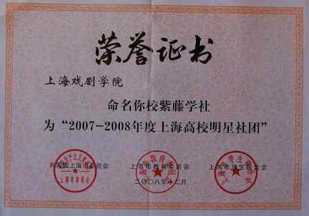 在团市委、市教委、市学联组织的“2007-2008年度上海高校明星社团”评选活动中,我校研究生部“紫藤学社”以优异的成绩被评为“2007-2008年度上海高校明星社团”,这是我校社团第一次获此殊荣。