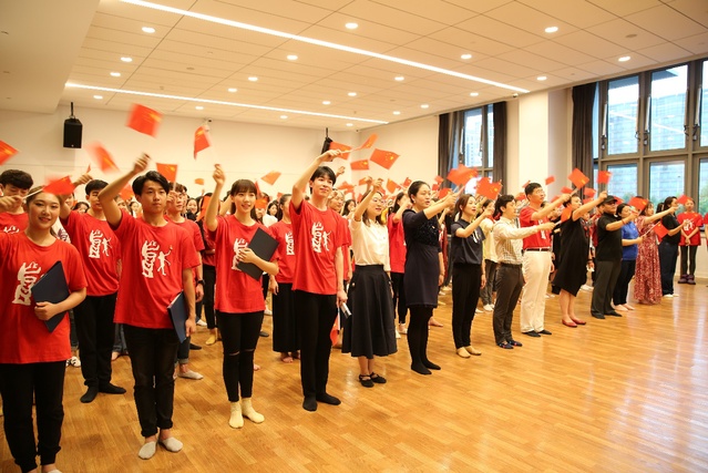 上海戏剧学院党委副书记胡敏,党委副书记、副院长张伟令,党委办公室副主任韩永胜以及电影电视学院、创意学院的老师、本科生和研究生们,在新启用的昌林路校区1号行政楼前厅参加了升旗仪式。仪式从庄严的升国旗、奏唱国歌环节开始,17级音乐剧表演专业研究生陈菲同学作国旗下的演讲,代表上戏学子在浦江之畔发出了新时代的青春之声。